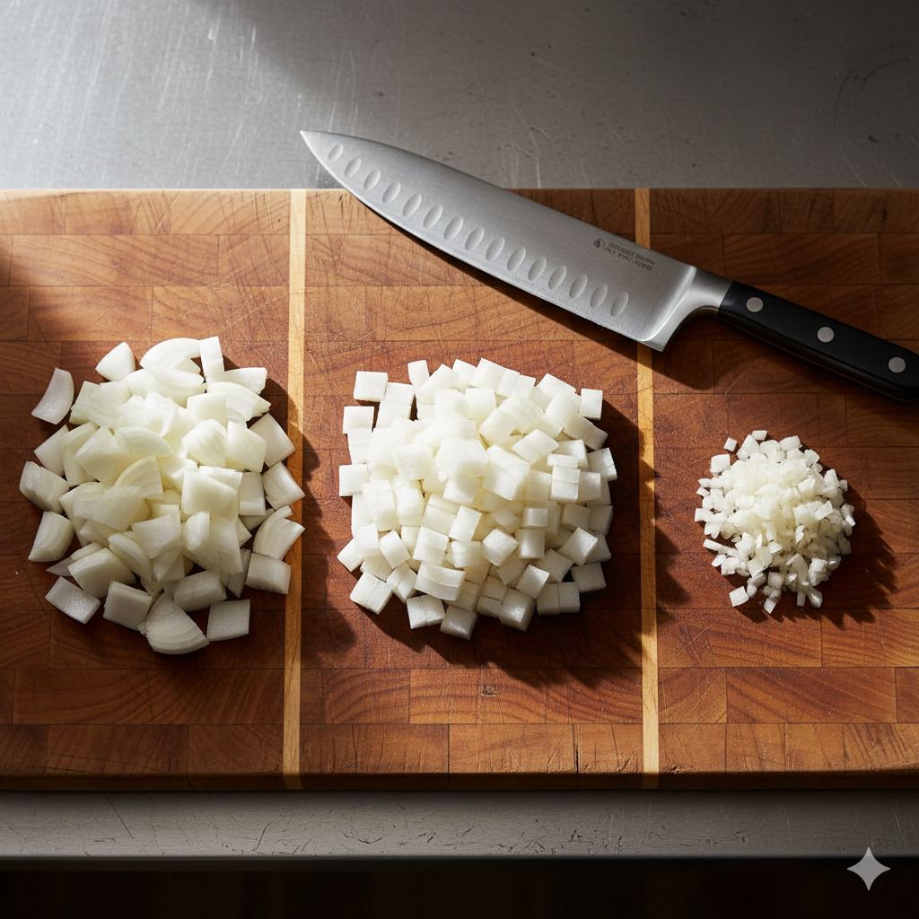 - “Dice the carrots into 1cm cubes.” (にんじんを1cm角のさいの目に切ります)