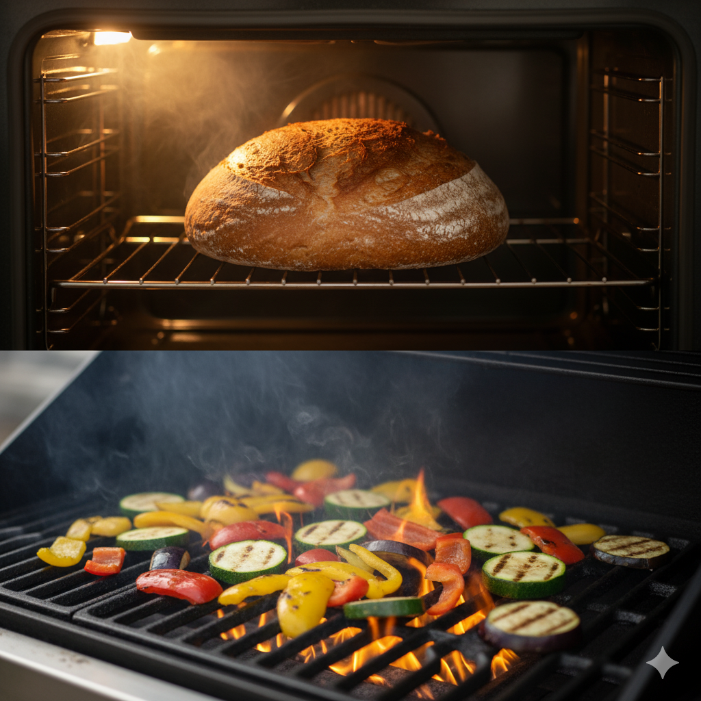 Grillは「グリルや金網の上で直火で焼く」という意味で、直接的な強い火で表面を焼いていくことを表します。ちなみにBarbeuqueという言葉も「焼く」という動詞になり、その名の通りバーベキューセットで肉や野菜を焼くときに使えますね。
