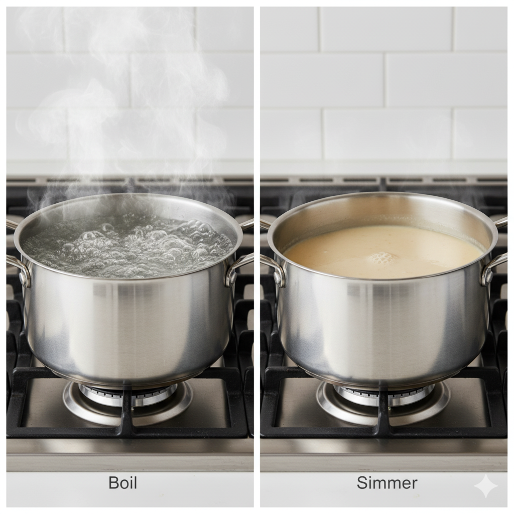 - “Bring to a boil, then reduce heat.” (沸騰させてから火を弱めます)